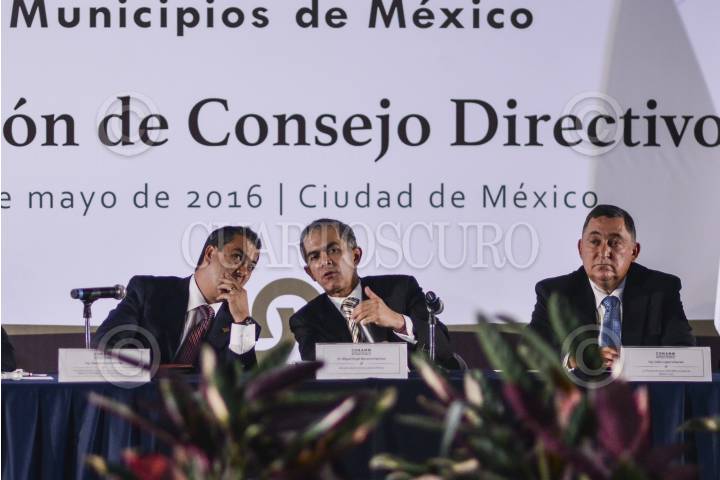 CIUDAD DE MÉXICO, 06MAYO2016.- Eleazar García Sánchez, presidente de la Conamm, Miguel Ángel Mancera, jefe de gobierno de la Ciudad de México y Isidro López Villareal, presidente entrente de la Conamm, durante la Reunión de Consejo Directivo de la Conferencia Nacional de Municipios de México (Conamm), en la cual tomó protesta como nuevo presidente Isidro López Villarreal, alcalde de Saltillo, Coahuila. FOTO: ADOLFO VLADIMIR /CUARTOSCURO.COM