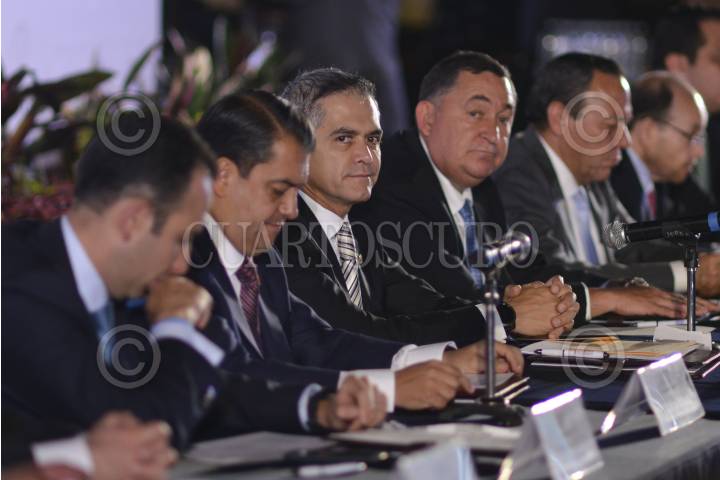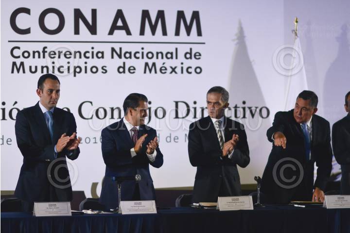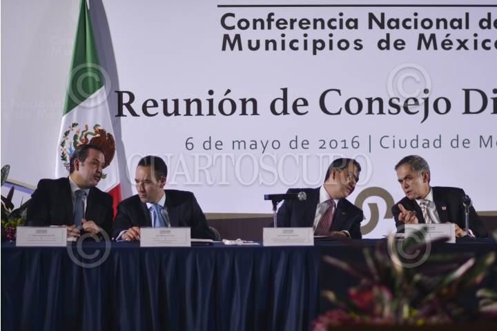 CIUDAD DE MÉXICO, 06MAYO2016.- Christian Von Roehrich, delegado de la Benito Juárez, Roberto Gil Zuarth, presidente del Senado de la República, Eleazar García Sánchez, presidente saliente de la Conamm, Miguel Ángel Mancera, jefe de gobierno de la Ciudad de México e Isidro López Villareal, presidente entrente de la Conamm, durante la Reunión de Consejo Directivo de la Conferencia Nacional de Municipios de México (Conamm), en la cual tomó protesta como nuevo presidente Isidro López Villarreal, alcalde de Saltillo, Coahuila. FOTO: ADOLFO VLADIMIR /CUARTOSCURO.COM