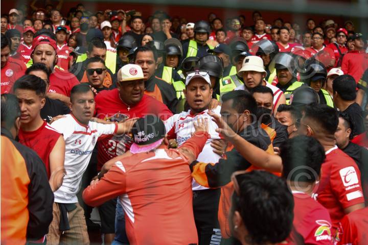 TOLUCA, ESTADO DE MÉXICO, 07ABRIL2024.- Se registra un conato de bronca entre aficionados de los Diablos de Toluca casi al término del segundo tiempo del encuentro en el estadio Nemesio Diez. FOTO: CRISANTA ESPINOSA AGUILAR /CUARTOSCURO.COM