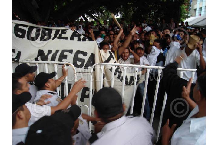 CHILPANCINGO, GUERRERO, 13SEPTIEMBRE2007. Egresados de la normal rural de Ayotzinapa protestaron afuera de la catedral de Santa Maria de la Asuncion para exigir la entrega de plazas para maestros rurales, cabe mencionar que en el interior de dicho edificio historico se desarrollaba la ceremonia oficial del 194 aniversario de la instalacion del "Primer Congreso de Anahuac" la cual fue presidida por el gobernador del estado Zeferino Torreblanca Galindo, suscitandose conatos de enfrentamiento entre los normalistas y policias del estado, quienes resguardaban el lugar desde temprana hora. FOTO.OSCAR ALVARADO/CUARTOSCURO.COM