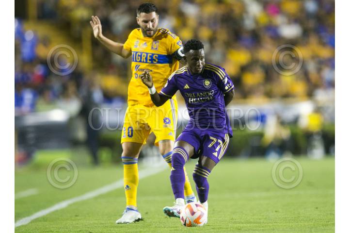 André Pierre Gignac se disputa el balón con Iván Angulo del Orlando City SC en la IDA de octavos de final de la Concacaf Champions League, en el estadio Universitario.