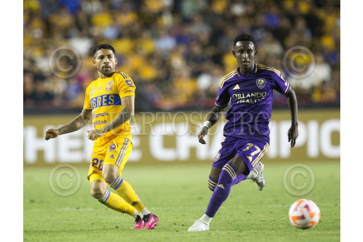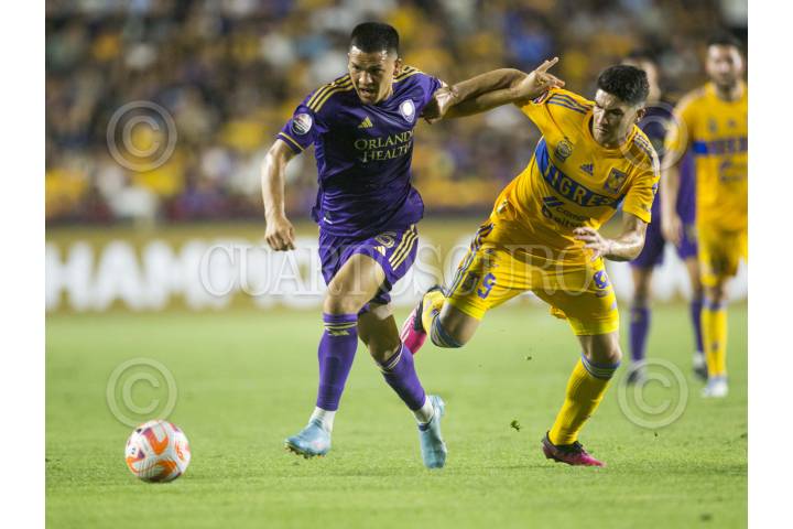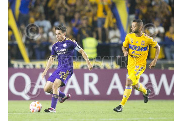 Rafael De Souza se disputa el balón con Mauricio Pereyra del Orlando City SC en la IDA de octavos de final de la Concacaf Champions League, en el estadio Universitario.