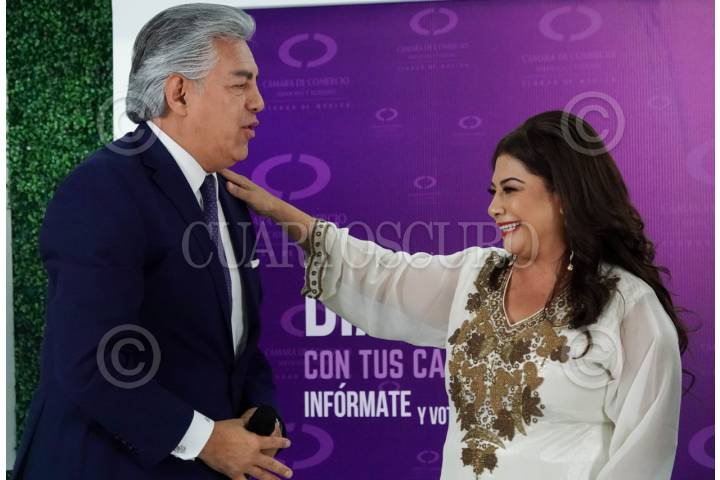 CIUDAD DE MÉXICO, 03ABRIL2024.- José de Jesús Rodríguez Cárdenas, presidente de la Canaco, y Clara Brugada, candidata a la jefatura de Gobierno por la alianza Sigamos Haciendo Historia (MORENA-PVEM-PT), tras la participación en el encuentro "Diálogo con tus candidatos" que organiza la Cámara de Comercio, Servicios y Turismo de la Ciudad de México (CANACO). FOTO: GALO CAÑAS/CUARTOSCURO.COM