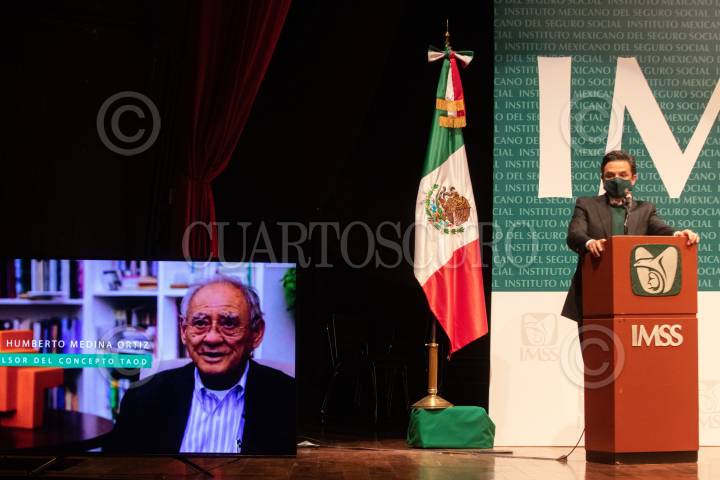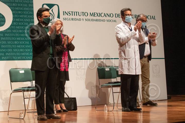 Zoe Robledo, Gisela Lara, Víctor Hugo Borja, y Manuel Cervantes Ocampo, brindan un aplauso en memoria de Humberto Medina Ortiz, impulsor del concepto TAOD en el IMSS.