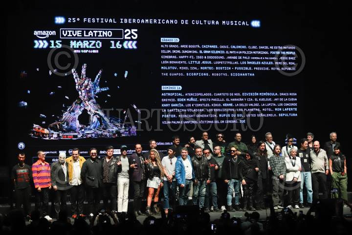 CIUDAD DE MÉXICO, 28ENERO2025.- Integrantes de las distintas bandas que forman parte del cartel del Festival Vive Latino en su edición número 25, se toman una fotografía al finalizar la conferencia de prensa. FOTO: DANIEL AUGUSTO/ CUARTOSCURO.COM