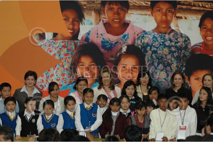MÉXICO, D.F., 19NOVIEMBRE2009.- Margarita Zavala, esposa del presidente Felipe Calderón se toma una fotografía con los niños asistentes al termino del evento de conclusión de las mesas regionales en materia de derechos de niñas, niños y adolescentes que se realizo en el salón Adolfo López Mateos de la residencia oficial de Los Pinos. FOTO: RODOLFO ANGULO/CUARTOSCURO.COM