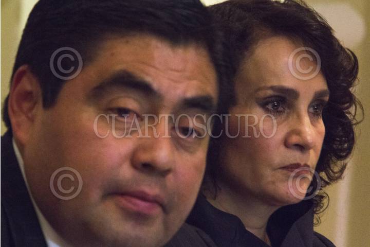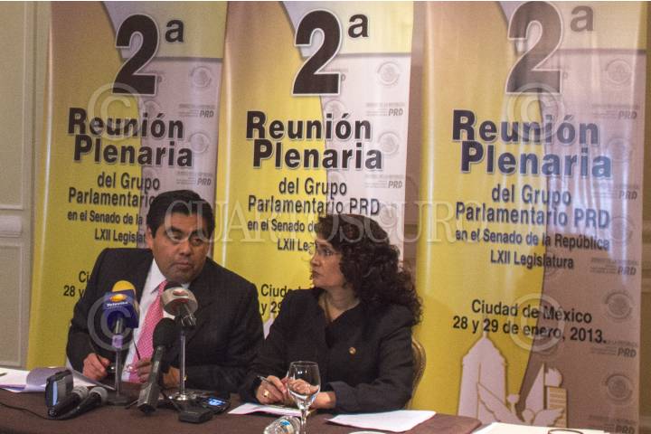 MÉXICO, D.F., 29ENERO2013.- Miguel Barbosa, Coordinador del PRD en el senado junto a Dolores Padierna, senadora perredista durante la conferencia de prensa que realizaron al término de la 2a Reunión Plenaria del Grupo Parlamentario del PRD en el Senado de la Republica LXII Legislatura la cual se realizó en un hotel de la zona de Reforma. FOTO: ENRIQUE ORDÓÑEZ /CUARTOSCURO.COM