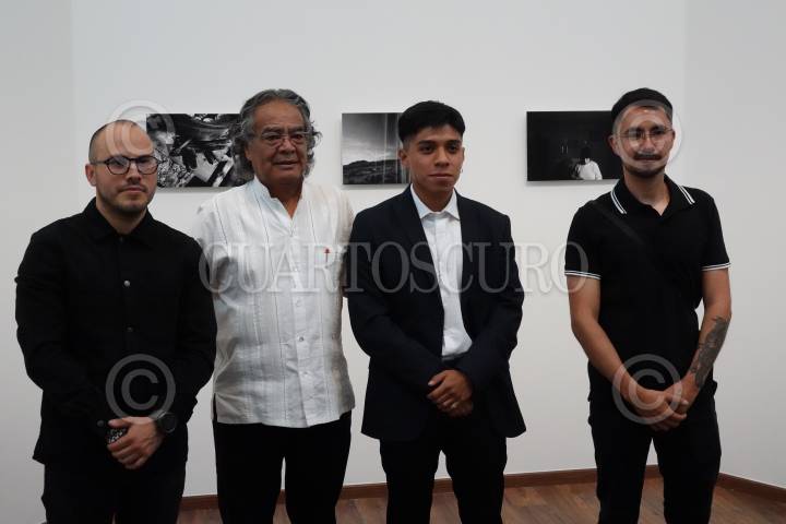 Guillermo Gutiérrez Velasco, Pedro Valtierra, Samuel Ramírez Velasco y José Manuel Castañeda durante la inauguración de la exposición "Identidad" en el Concurso Nacional de Fotografía Cuartoscuro 2023 en la fundación Marso de la alcaldía Juárez, alcaldía Cuauhtémoc.