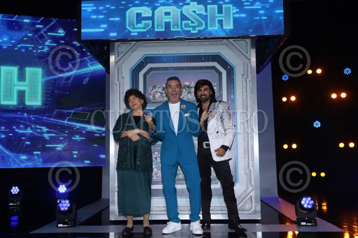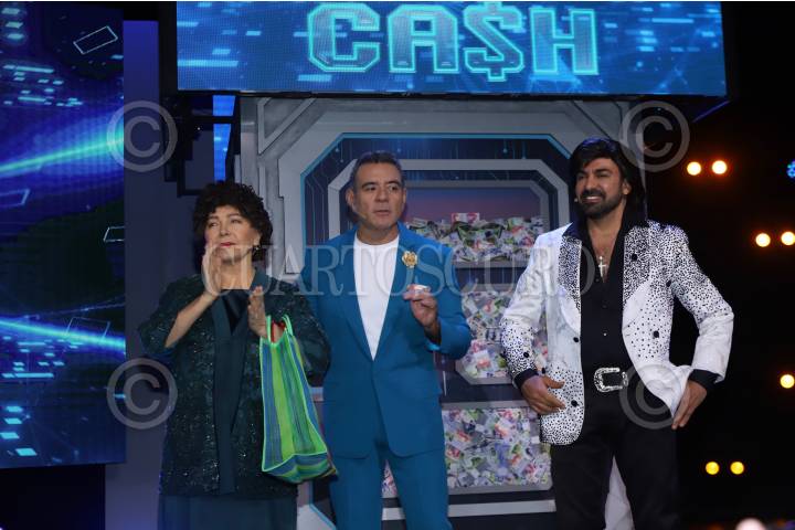CIUDAD DE MÉXICO, 04JUNIO2024. Mara Escalante “Doña Lucha”, Héctor Sandarti y Ariel Miramontes “Albertano” durante la presentación del nuevo programa de concursos de Televisa Univision “Cash, el peso del dinero VIP”. FOTO: EDGAR NEGRETE LIRA/CUARTOSCURO.COM