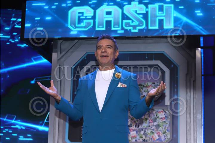CIUDAD DE MÉXICO, 04JUNIO2024. El conductor Héctor Sandarti durante la presentación del nuevo programa de concursos de Televisa Univision “Cash, el peso del dinero VIP”. FOTO: EDGAR NEGRETE LIRA/CUARTOSCURO.COM