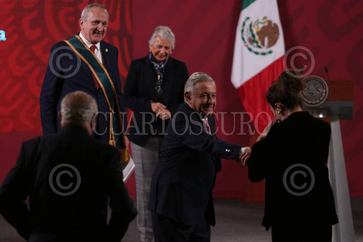 Andrés Manuel López Obrador y Olga Sáncez Cordero, secretaria de Gobernación, durante la entrega de la condecoración Miguel Hidalgo a Jesús Seade Kuri.