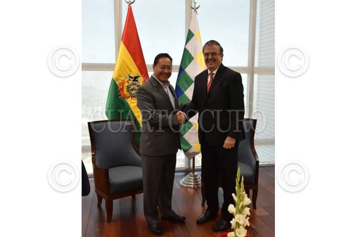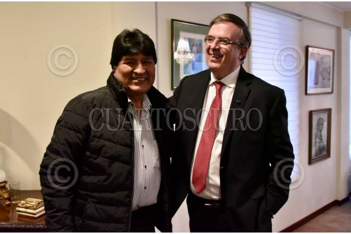 Evo Morales, ex presidente de Bolivia, y el canciller Marcelo Ebrard durante su visita en Bolivia