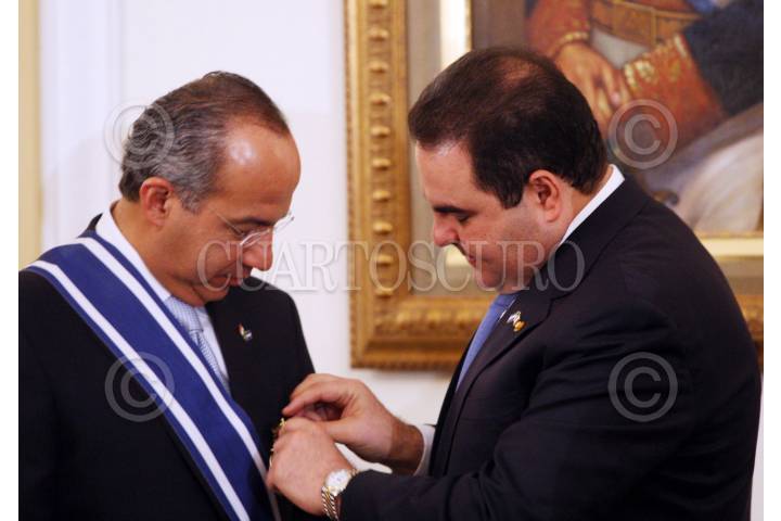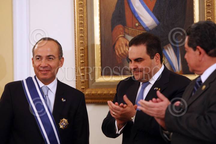 SAN SALVADOR, REPUBLICA DE EL SALVADOR., 04 MARZO 2008.-El presidente Felipe Calderon , durante la cena en su honor que ofreció Antonio Elias Saca Presidente de El Salvador donde el presidente Mexicano fué condecorado con la orden José Matias en el grado de la gran cruz placa de oro FOTO : ALFREDO GUERRERO/CUARTOSCURO.COM