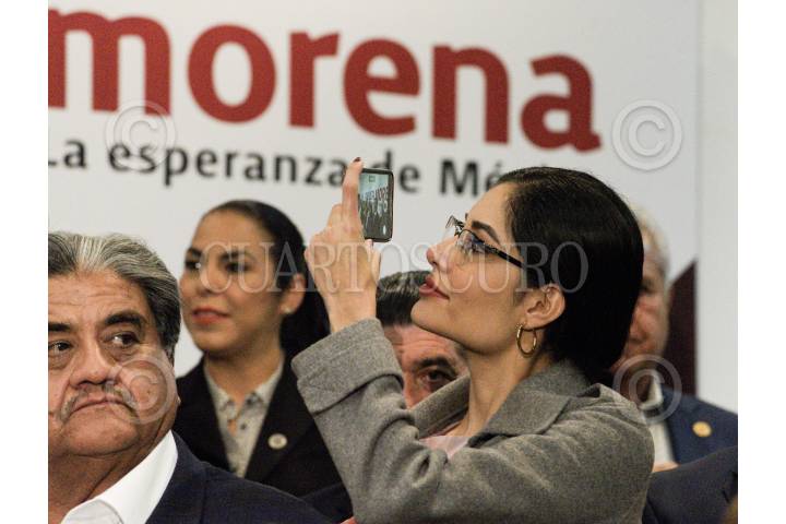 CIUDAD DE MÉXICO, 25JULIO2019.- La diputada Geraldine Ponce toma unas fotografías con su celular durante la conferencia de Mario Delgado en la que presentó la consulta “13 Desafíos para que siga la 4ta Transformación” rumbo a la renovación de Morena. FOTO: MARIO JASSO /CUARTOSCURO.COM