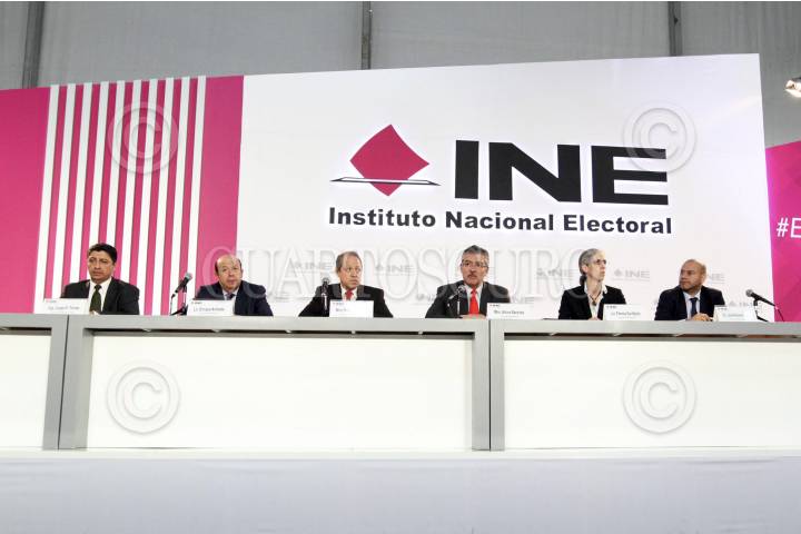 MÉXICO, D.F., 11JUNIO2015.- Jorge Torres Antuñano, coordinador General de la Unidad Técnica de Servicios de Informática, la Consejera y los Consejeros Electorales Enrique Andrade González, Marco Antonio Baños Martínez, Arturo Sánchez Gutiérrez, Pamela San Martín Ríos y Valles y Roberto Ruíz Saldaña, durante la conferencia de prensa de Comisiones Unidas del INE en las instalaciones de la macrosala de prensa del Instituto. FOTO: CUARTOSCURO.COM