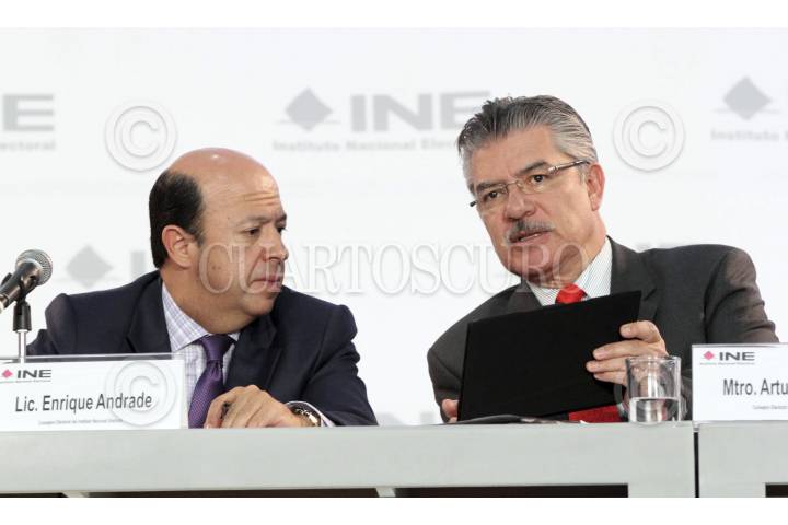 MÉXICO, D.F., 11JUNIO2015.- Los consejeros electorales Enrique Andrade González y Arturo Sánchez Gutiérrez, durante la conferencia de prensa de Comisiones Unidas del INE en las instalaciones de la macrosala de prensa del Instituto. FOTO: CUARTOSCURO.COM