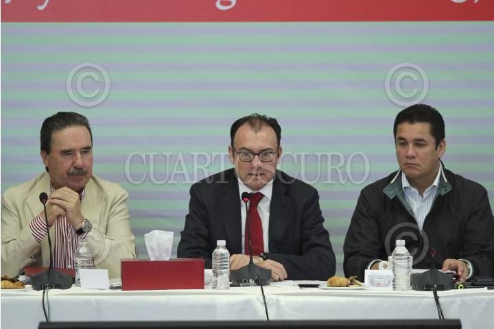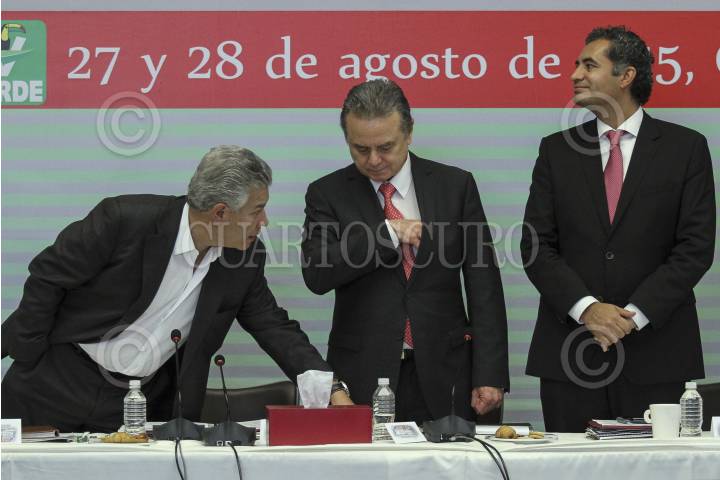 MÉXICO, D.F., 28AGOSTO2015.- Emilio Gamboa Patrón, coordinador de la bancada priísta en el Senado de la República, Luis Videgaray Caso, Secretario de Hacienda y Crédito Público y Carlos Alberto Puente Salas, coordinador de los senadores del Partido Verde Ecologista de México, durante la VII Reunión Plenaria de los senadores del PRI y PVEM. FOTO: ADOLFO VLADIMIR /CUARTOSCURO.COM
