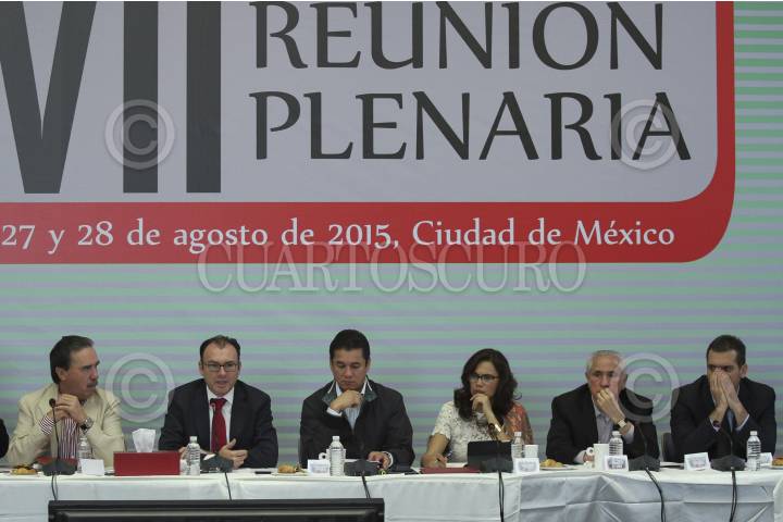 MÉXICO, D.F., 28AGOSTO2015.- Emilio Gamboa Patrón, coordinador de la bancada priísta en el Senado de la República, Luis Videgaray Caso, Secretario de Hacienda y Crédito Público, Carlos Alberto Puente Salas, coordinador de los senadores del Partido Verde Ecologista de México, Blanca Alcalá, senadora por el PRI y Jorge Emilio González, senadores por el PVEM, durante la VII Reunión Plenaria de los senadores del PRI y PVEM. FOTO: ADOLFO VLADIMIR /CUARTOSCURO.COM