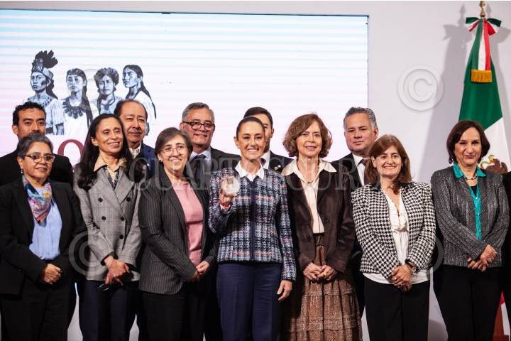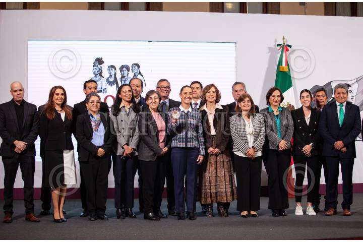 CIUDAD DE MÉXICO, 06FEBRERO2025.- Claudia Sheinbaum Pardo, presidenta de México y los secretarios que formarán parte de la operación del Centro Nacional de diseño de semiconductores durante conferencia de prensa en Palacio Nacional. FOTO: ANDREA MURCIA /CUARTOSCURO.COM