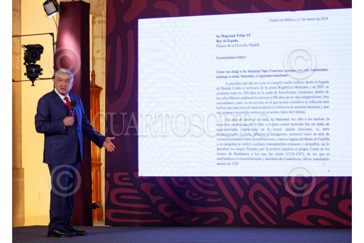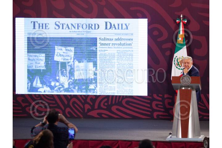 CIUDAD DE MÉXICO, 26SEPTIEMBRE2024.- Andrés Manuel López Obrador, presidente de México en Palacio Nacional durante conferencia de prensa donde se dedicó a responder preguntas a medios de comunicación . En la imagen muestra una portada de periódico con la presidenta electa, Claudia Sheinbaum Pardo en protesta contra Salinas. FOTO: ANDREA MURCIA /CUARTOSCURO.COM