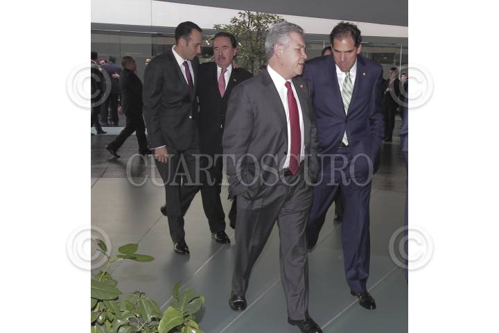 MÉXICO, D.F., 05DICIEMBRE2013.- Roberto Gil Zuarth, Senador por PAN, Emilio Gamboa Patrón, Coordinador en el Senado de la bancada del PRI y David Penchyna Grub, presidente de la Comisión de Energía, en el recinto de la cámara alta, en donde dará inicio la discusión de la Reforma Energética. FOTO: CUARTOSCURO.COM