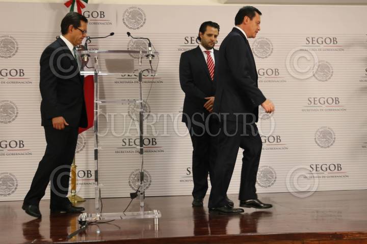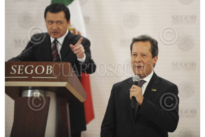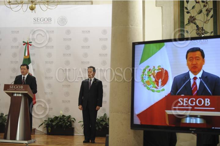 MÉXICO, D.F., 10ABRIL2013.- Miguel Ángel Osorio Chong, secretario de Gobernación y Eduardo Sánchez, subsecretario de Normatividad de Medios de la Segob, ofrecieron una conferencia de prensa para dar a conocer la primera evaluación del gobierno de Enrique Peña Nieto en el tema de la seguridad. FOTO: IVÁN MÉNDEZ /CUARTOSCURO.COM