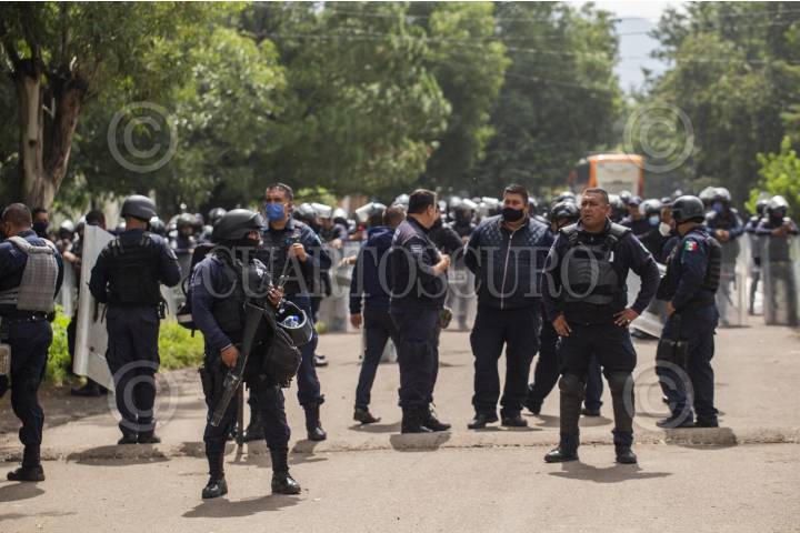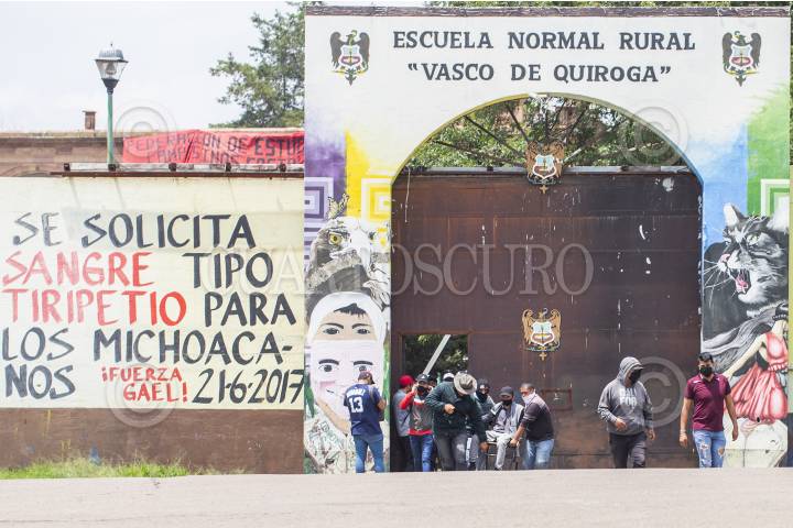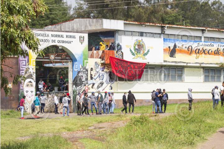 Elementos de la policía de Michoacán afuera de la Escuela Normal Rural Vasco de Quiroga.