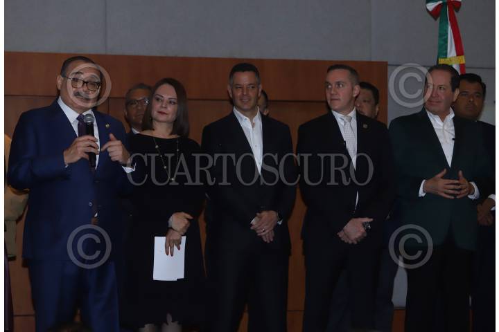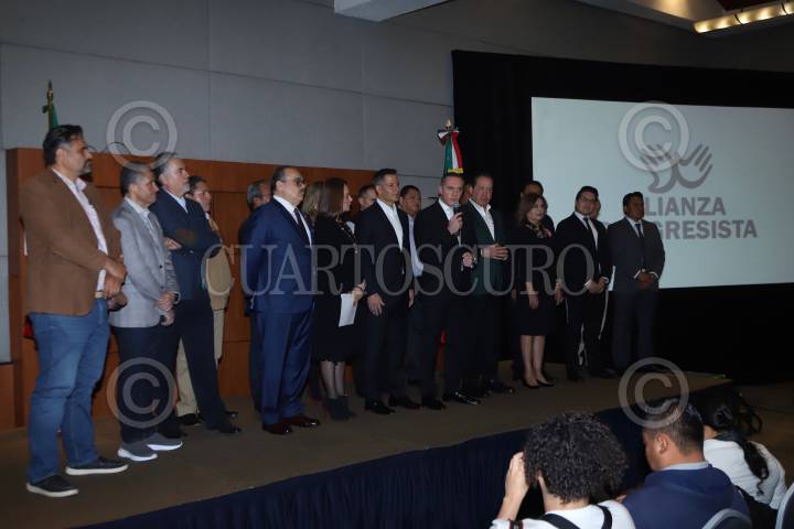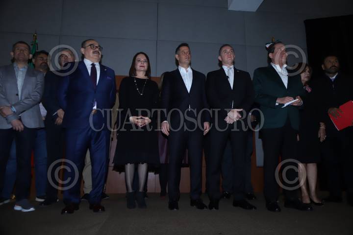 CIUDAD DE MÉXICO, 19DICIEMBRE2023. Jorge Carlos Ramírez Marín, Nuvia Mayorga, Alejandro Murat Hinojosa, Adrián Rubalcaba y Eruviel Ávila asistieron a la conferencia de prensa donde se dió a conocer la conformación de la agrupación política “Alianza Progresista”, que reúne a distintos actores políticos a favor de la precandidata presidencial de Morena, Claudia Sheinbaum. FOTO: EDGAR NEGRETE LIRA/CUARTOSCURO.COM