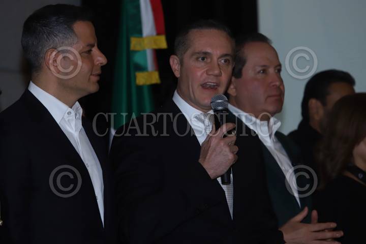CIUDAD DE MÉXICO, 19DICIEMBRE2023. Alejandro Murat Hinojosa, Adrián Rubalcaba y Erubiel Ávila durante la conferencia de prensa donde se dió a conocer la conformación de la agrupación política “Alianza Progresista”, que reúne a distintos actores políticos a favor de la precandidata presidencial de Morena, Claudia Sheinbaum. FOTO: EDGAR NEGRETE LIRA/CUARTOSCURO.COM