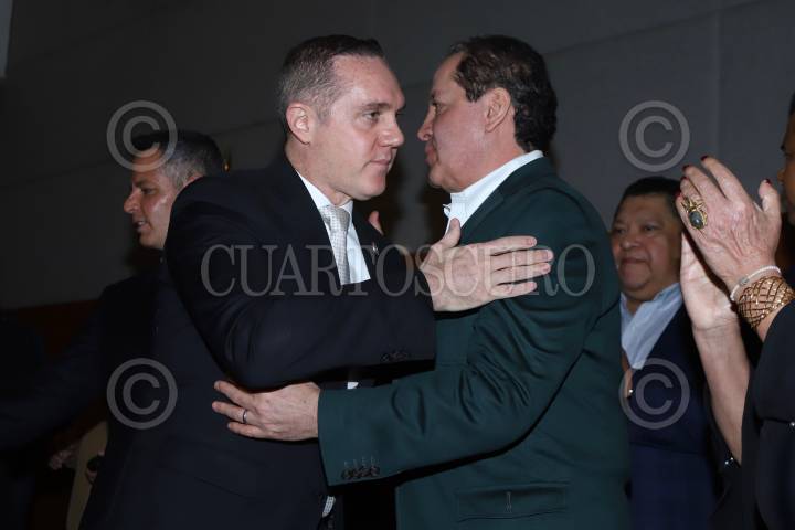 CIUDAD DE MÉXICO, 19DICIEMBRE2023. Adrián Rubalcaba y Erubiel Ávila se saludan durante la conferencia de prensa donde se dió a conocer la conformación de la agrupación política “Alianza Progresista”, que reúne a distintos actores políticos a favor de la precandidata presidencial de Morena, Claudia Sheinbaum. FOTO: EDGAR NEGRETE LIRA/CUARTOSCURO.COM