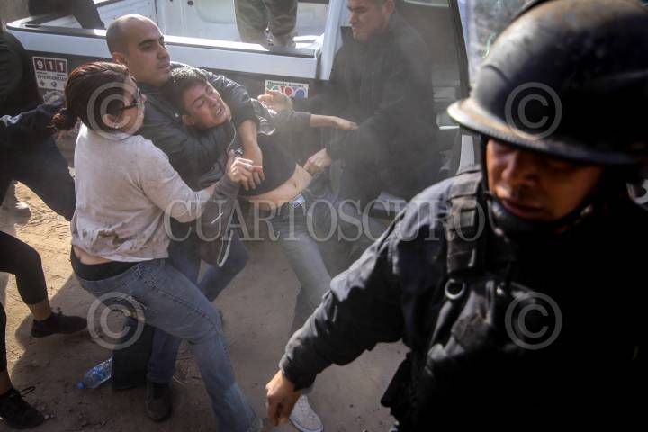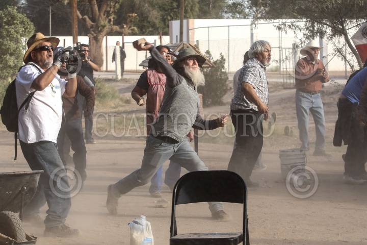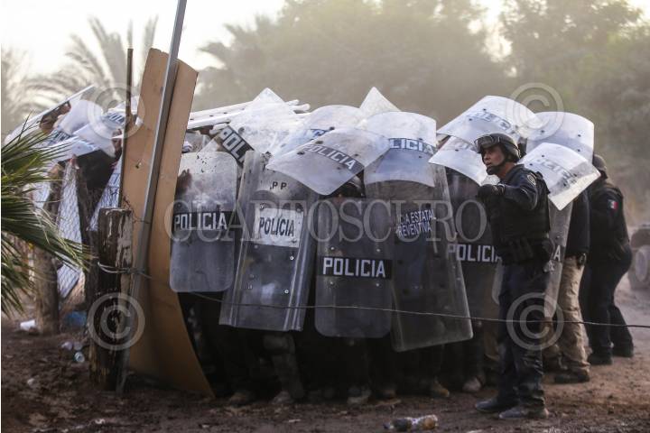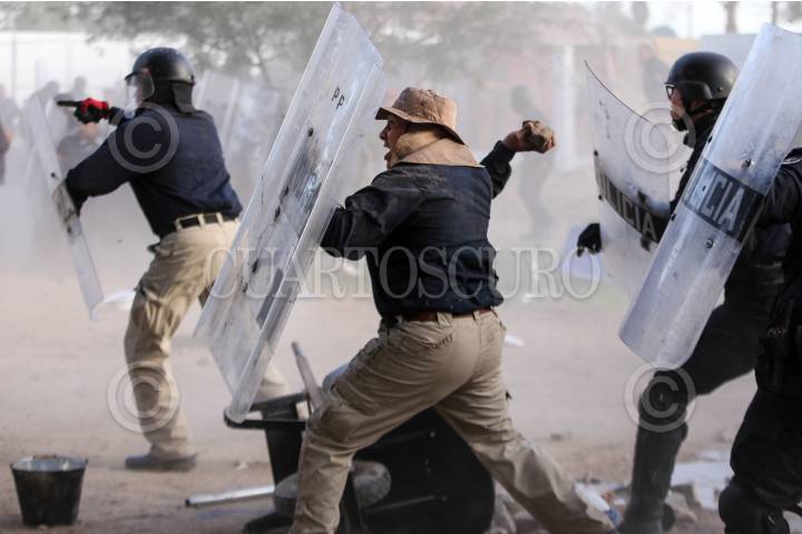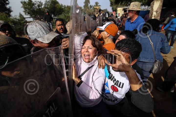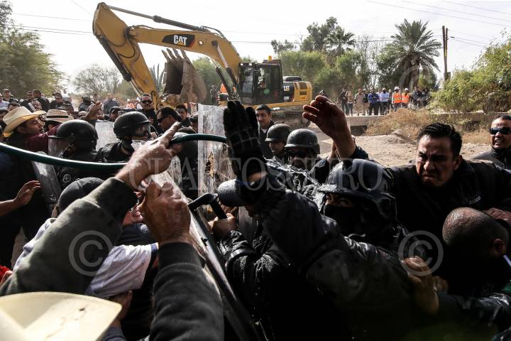 MEXICALI, BAJA CALIFORNIA, 16ENERO2018.- Policías Municipales, Estatales y Ministeriales se enfrentaron con manifestantes este martes luego de que trabajadores de la planta Constellation Brands intentaran comenzar trabajos en la construcción de un ducto que pretende surtir de agua la planta cervecera y fueran impedidos por los opositores a esta construcción. Tras cinco enfrentamientos y choques, la policía entró en un predio privado para replegar a los manifestantes quienes respondieron arrojando rocas a la maquinaria pero minutos después se derivó en una guerra campal de piedras entre ambos bandos dejando como saldo cinco personas detenidas y múltiples lesionados por golpes de piedras. FOTO: VÍCTOR MEDINA /LACRONICACOM /CUARTOSCURO.COM