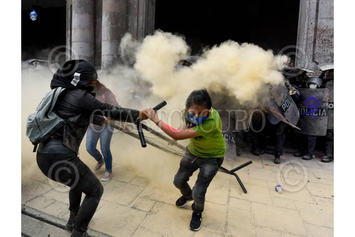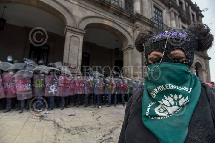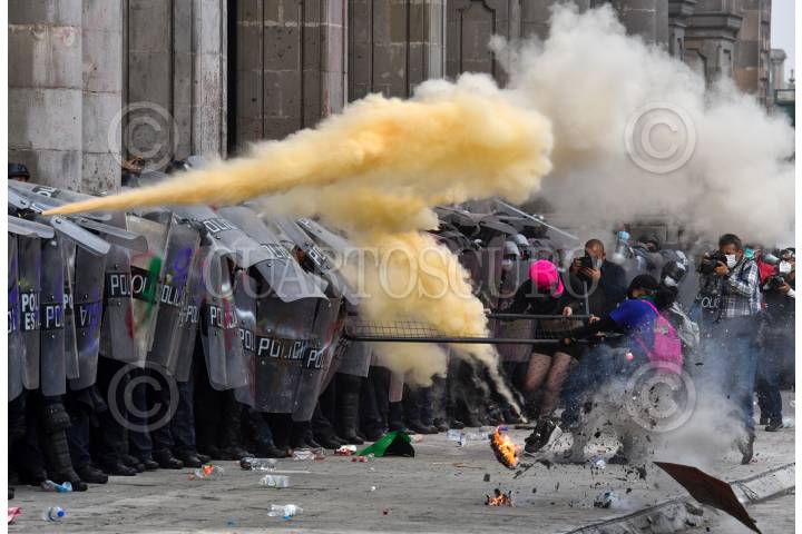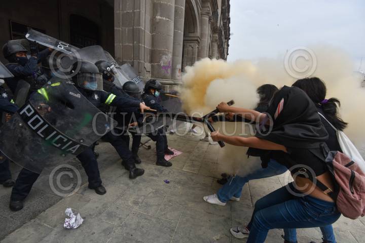 Mujeres que participaron en la Marcha del Día Internacional de la Mujer al llegar a Palacio de Gobierno tuvieron una confrontación con policías estatales los cuales respondieron con polvo de extintor.