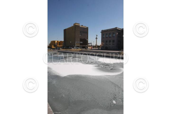 NUEVO LAREDO, TAMAULIPAS, 04ENERO2011.- Las bajas temperaturas de hasta menos seis grados que se dejaron sentir en la región convirtieron a las fuentes congeladas en un atractivo para la población en general que acudió hasta estos lugares para tomarse fotografías del recuerdo durante las últimas horas en tanto que se espera que el clima mejore en las próximas 24 horas. FOTO: JOAQUIN MURRIETA/CUARTOSCURO.COM