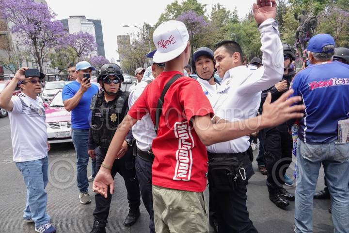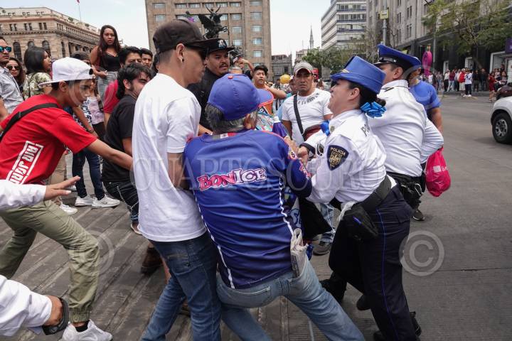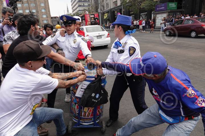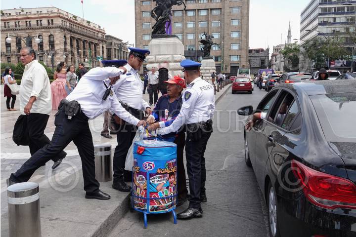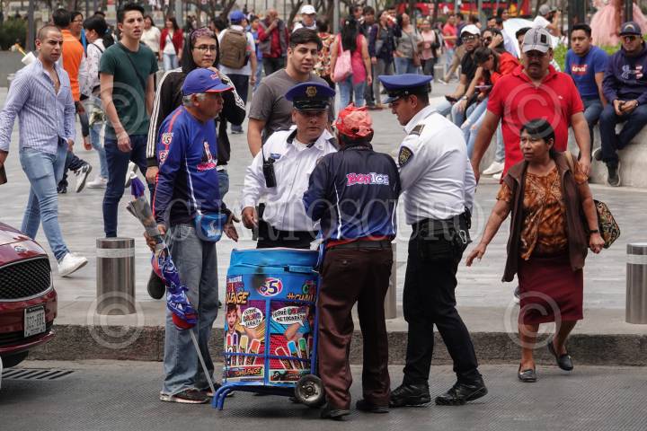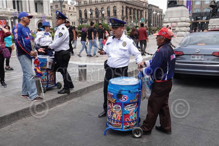 Policías intentan a retirar a un par de vendedores de congeladas de avenida Juárez
