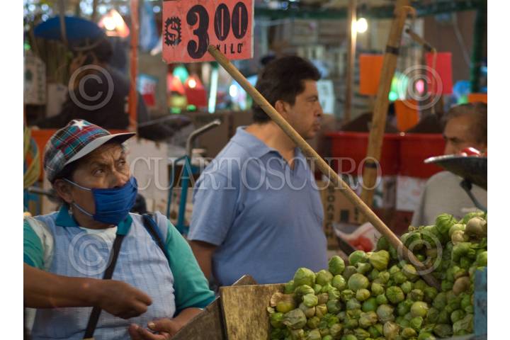 MÉXICO, D.F., 01MAYO2009.- Una mujer porta cubre bocas compra productos de canasta básica en el mercado de la Merced; el uso del cubre bocas en áreas en donde se congregan muchas personas se recomienda como medida para evitar la propagación del virus de la influenza humana AH1N1. FOTO: RODOLFO ANGULO/CUARTOSCURO.COM