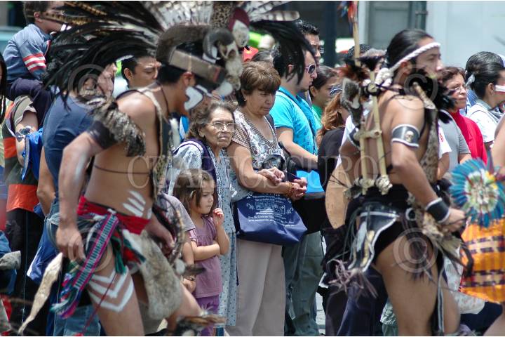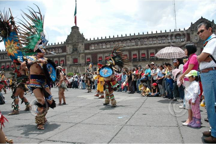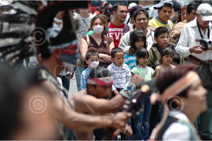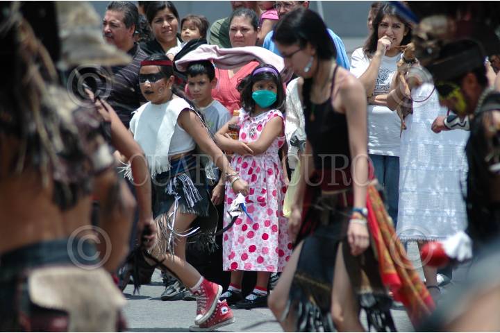 MÉXICO, D.F., 17MAYO2009.- A pesar de las recomendaciones de la secretaria de salud de evitar estar en lugares con mucha gente y de usar cubre bocas para evitar el contagio del virus de la influenza humana, decenas de personas se congregan alrededor de un grupo de danzantes en la plancha del Zócalo capitalino. FOTO: RODOLFO ANGULO/CUARTOSCURO.COM