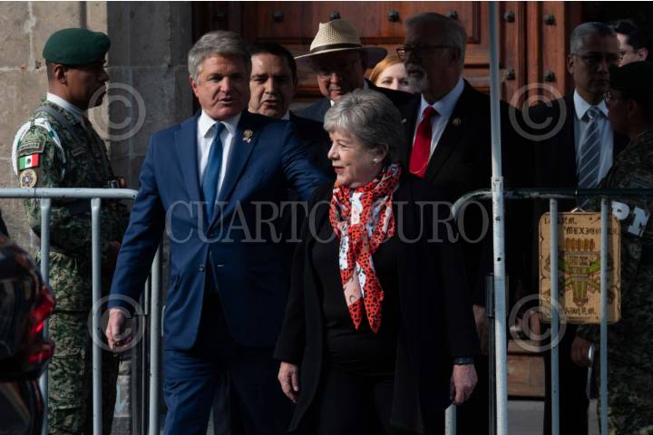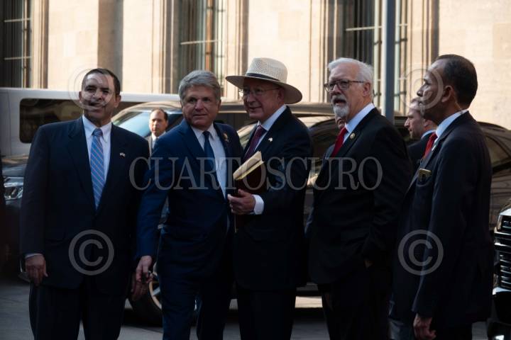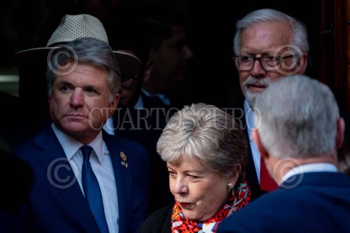 CIUDAD DE MÉXICO, 23ENERO2024.- El congresista Michael McCaul, Alicia Bárcena, canciller mexicana, los congresistas Randy Weber y Henry Cuéllar, así como el embajador Ken Salazar se retiran tras la reunión con el presidente Andrés Manuel López Obrador en Palacio Nacional. FOTO: GALO CAÑAS/CUARTOSCURO.COM