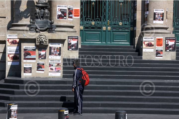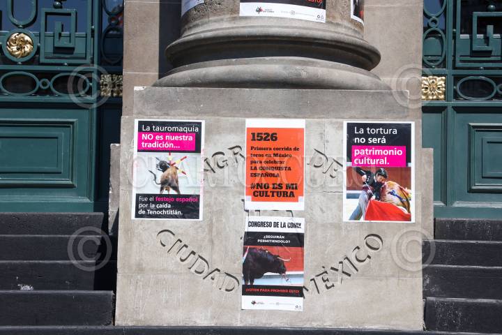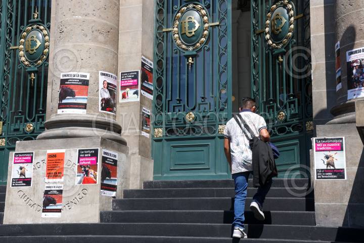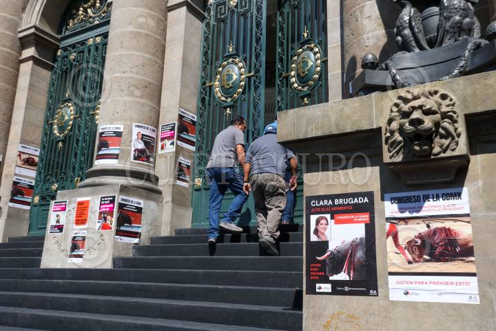 CIUDAD DE MÉXICO, 12FEBRERO2025.- Grupo de colectivos pegaron cárteles contra las corridas de toros en la fachada del Congreso de la Ciudad de México, para a exigirle a los diputados locales la suspensión definitiva de las corridas de toros en la capital. FOTO: MOISÉS PABLO/CUARTOSCURO.COM
