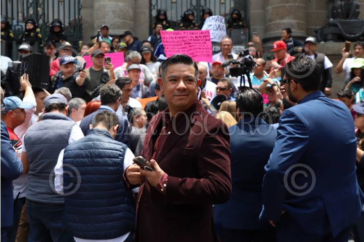 CIUDAD DE MÉXICO, 23JULIO2025.- El diputado local de Morena, Juan Estuardo Gualito, fue encarado por los comerciantes y locatarios que se manifestaban afuera del congreso de la ciudad, luego de que es uno de los implicados en realizar centros de abasto cerca de los mercados y que afecta las ventas de los comerciantes. FOTO: DANIEL AUGUSTO/ CUARTOSCURO.COM