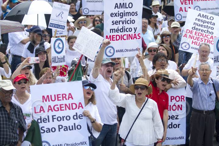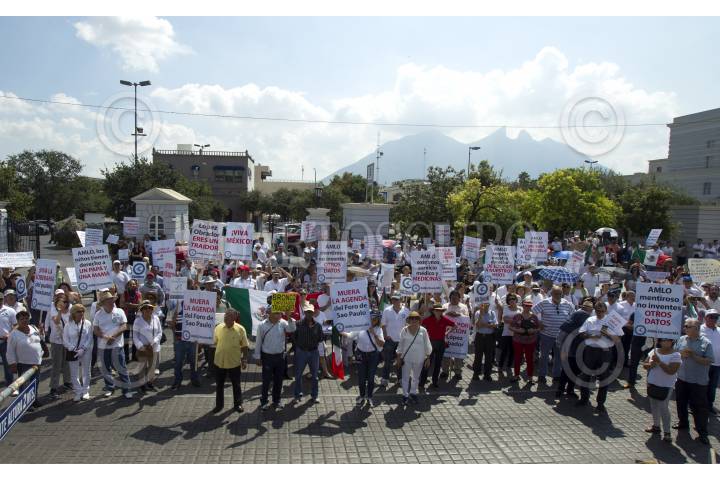 MONTERREY, NUEVO LEÓN, 30JUNIO2019.- Cientos de personas se congregaron en la Explanda de los Héroes para marchar por las principales calles de la ciudad en contra del gobierno de Andrés Manuel López Obrador, misma que se estaría realizando simultáneamente en más de 20 ciudades de México, Estados Unidos, Alemania y Canadá. La protesta fue encabezada por Gilberto Lozano, fundador del Congreso Nacional Ciudadano. FOTO: GABRIELA PÉREZ MONTIEL /CUARTOSCURO.COM