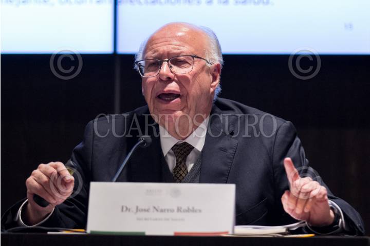 CIUDAD DE MÉXICO, 18ENERO2018.- José Narro Robles, secretario de Salud, informó en conferencia de prensa las causas del brote de conjuntivitis efectuado el pasado 12 de enero durante la inauguración del Centro Nacional de Tecnologías Aeronáuticas y la entrega del Premio a Investigación 2017, que afectó al presidente Enrique Peña Nieto y a otros 28 integrantes del gabinete. Narro Robles especificó que la irritación se produjo debido a la exposición a rayos Ultravioletas (UV) producidos por las lámparas de alógeno que se colocaron cerca del presídium. De igual modo, el secretario de salud estableció que la investigaciones continuarán y de ser necesario emitirán medidas de seguridad para eventos próximos. FOTO: GALO CAÑAS /CUARTOSCURO.COM