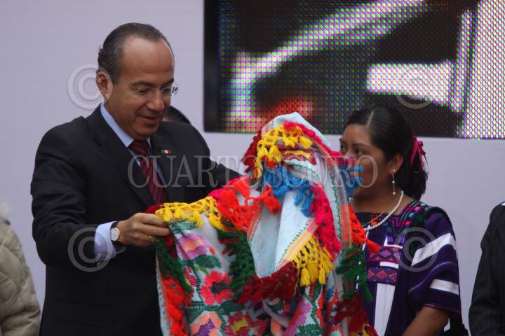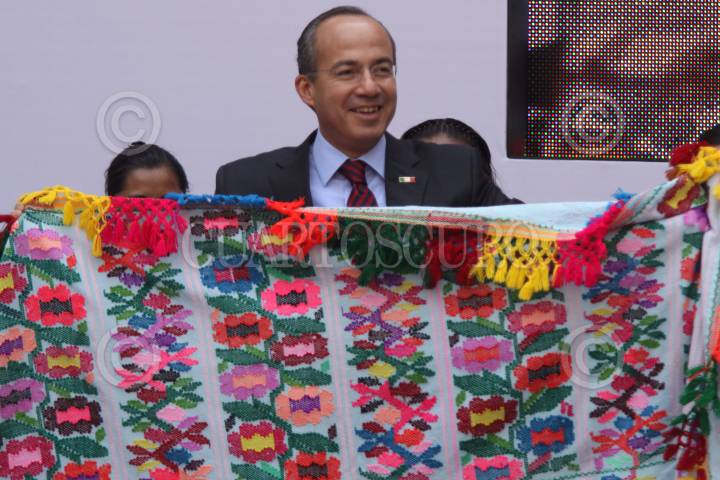 MÉXICO D.F., 07MARZO2009.- Felipe Calderón Hinojosa presidente de México recibió de manos de mujeres indigenas un bordado, durante la celebración del día internacional de la mujer que se conmemora cada 8 de Marzo, el festejo fué realizado en el patio central de Palacio Nacional. FOTO: SÁSHENKA GUTIÉRREZ/CUARTOSCURO.COM