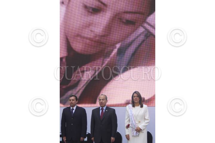 MÉXICO D.F., 07MARZO2009.- Ernesto Cordero titular de la SEDESOL, Felipe Calderón Hinojosa presidente de México, Margarita Zavala primera damana, entonan el himno nacional, durante la celebración del día internacional de la mujer realizado en el patio central de Palacio Nacional. FOTO: SÁSHENKA GUTIÉRREZ/CUARTOSCURO.COM