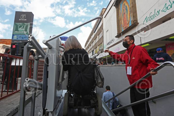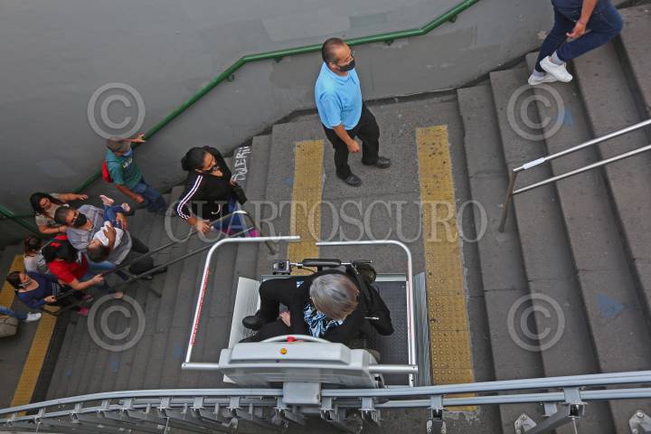 Una mujer de edad adulta y con discapacidad se traslada para poder abordar el tren en una plataforma especial para personas con capacidades diferentes, esto en la línea 2 del Tren Eléctrico Urbano de Guadalajara.