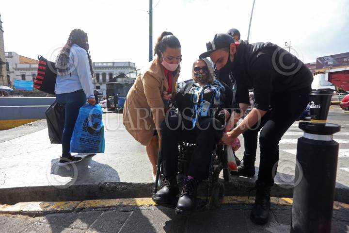 Una mujer de edad adulta y con discapacidad pide apoyo a transeúntes para poder trasladarse a abordar el Tren Eléctrico Urbano de Guadalajara.