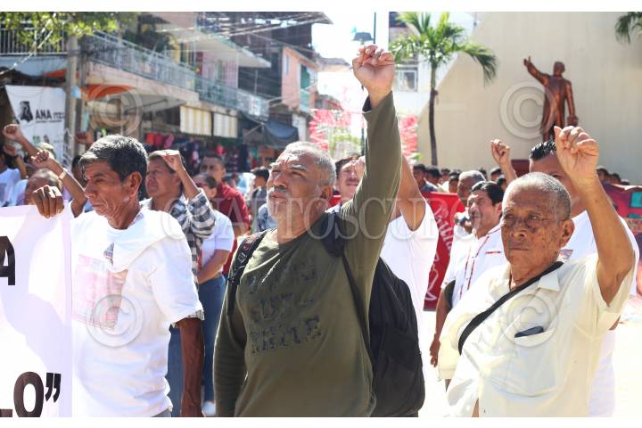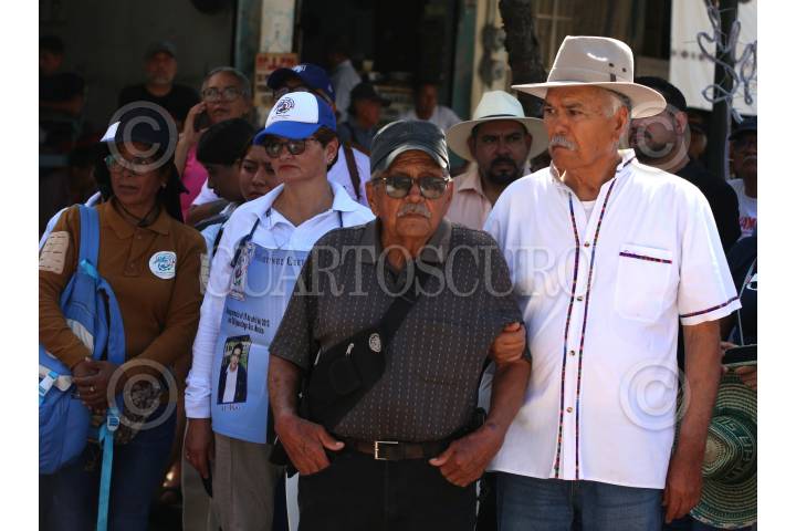 ATOYAC DE ALVAREZ, GUERRERO, 02DICIEMBRE2024.-Familiares de guerrilleros que participaron en el Movimiento Socialista Armado de México marcharon en este municipio para conmemorar la caída en combate de Lucio Cabañas el dos de diciembre de 1974 en la cañada del Otatal en el municipio de Tecpan de Galeana. La marcha fue encabezada por Micaela Cabañas Ayala, hija del maestro normalista, que después de la matanza del 18 de mayo de 1967 se remonto a la sierra cafetalera de este municipio para organizar el Partido de los Pobres y su Brigada Campesina de Ajusticiamiento que opero hasta su muerte. Los familiares de guerrilleros estuvieron acompañados por estudiantes de la Normal Rural de Ayotzinapa, familias de personas desaparecidas en la actualidad y lideres de organizaciones sociales de izquierda. La marcha concluyo con un mitin en el zócalo de la ciudad, a los pies del profesor Lucio Cabañas Barrientos. En la imagen al centro, Florencio Lugo Hernández, ex guerrillero que participo en el asalto al cuartel de Madera, Chihuahua el 23 de septiembre de 1965 y actualmente único sobreviviente de esa acción guerrillera. FOTO: MARGARITO PÉREZ RETANA/CUARTOSCURO.COM