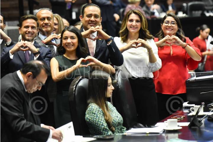 CIUDAD DE MÉXICO, 08ABRIL2025.- Gissel Santander Soto, diputada de Morena, junto a sus compañeros de bancada, durante la sesión solemne en conmemoración del 494 aniversario de la fundación de la ciudad de Puebla de Zaragoza. FOTO: MARIO JASSO/CUARTOSCURO.COM
