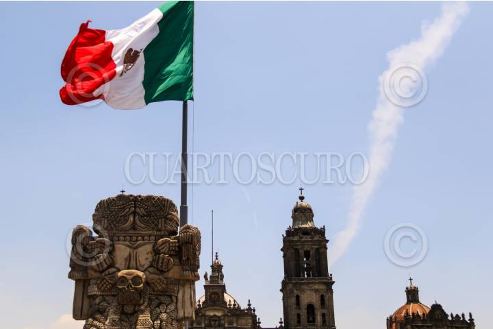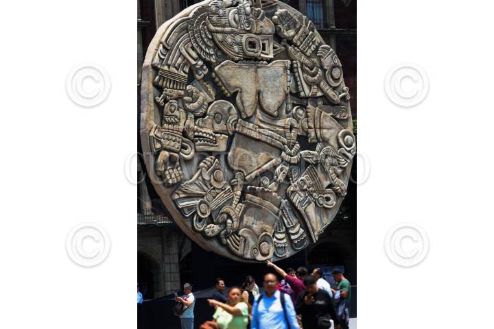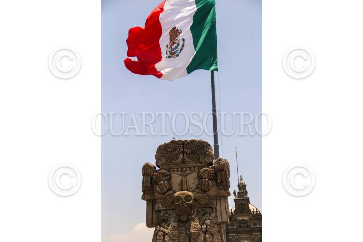 CIUDAD DE MÉXICO. 16JULIO2025.- Imágenes prehispánicas alusivas a la gran Tenochtitlán, en el Zócalo de la Capital Mexicana. FOTO: VICTORIA VALTIERRA/CUARTOSCURO.COM