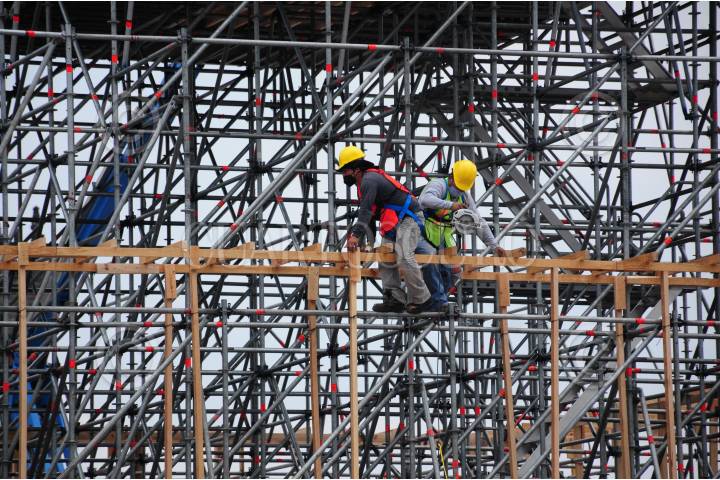 Dos trabajadores construyen uno de los muros de la pirámide.