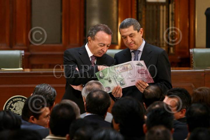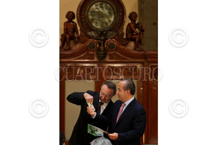 MÉXICO D.F., 23SEPTIEMBRE2009.- Guillermo Ortiz, gobernador del Banco de México muestra al presidente Felipe Calderón un billete conmemorativo durante el evento de la presentación de los billetes conmemorativos del Centenario de la Revolución y Bicentenario de la Independencia que se realizo en el Salón Tesorería de Palacio Nacional. FOTO: RODOLFO ANGULO/CUARTOSCURO.COM